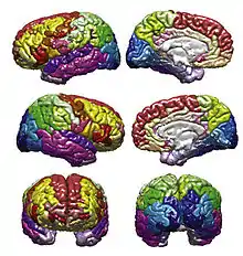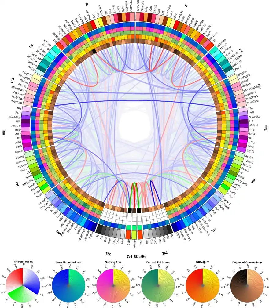 Connectograms are circular, with the left half depicting the left hemisphere and the right half depicting the right hemisphere. The hemispheres are further broken down into frontal lobe, insular cortex, limbic lobe, temporal lobe, parietal lobe, occipital lobe, subcortical structures, and cerebellum. At the bottom the brain stem is also represented between the two hemispheres. Within these lobes, each cortical area is labeled with an abbreviation and assigned its own color, which can be used to designate these same cortical regions in other figures, such as the parcellated brain surfaces in the adjacent image, so that the reader can find the corresponding cortical areas on a geometrically accurate surface and see exactly how disparate the connected regions may be. Inside the cortical surface ring, the concentric circles each represent different attributes of the corresponding cortical regions. In order from outermost to innermost, these metric rings represent the grey matter volume, surface area, cortical thickness, curvature, and degree of connectivity (the relative proportion of fibers initiating or terminating in the region compared to the whole brain). Inside these circles, lines connect regions that are found to be structurally connected. The relative density (number of fibers) of these connections is reflected in the opacity of the lines, so that one can easily compare various connections and their structural importance. The fractional anisotropy of each connection is reflected in its color.[1]