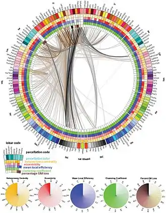 With the recent concerted push to map all of the human brain and its connections,[8][9] it has become increasingly important to find ways to graphically represent the large amounts of data involved in connectomics. Most other representations of the connectome use 3 dimensions, and therefore require an interactive graphical user interface.[1] The connectogram can display 83 cortical regions within each hemisphere, and visually display which areas are structurally connected, all on a flat surface. It is therefore conveniently filed in patient records, or to display in print. The graphs were originally developed using the visualization tool called Circos.[10][11]