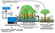 Constructed subsurface flow wetlands are meant as secondary treatment systems which means that the effluent needs to first pass a primary treatment which effectively removes solids. Such a primary treatment can consist of sand and grit removal, grease trap, compost filter, septic tank, Imhoff tank, anaerobic baffled reactor or upflow anaerobic sludge blanket (UASB) reactor.[4] The following treatment is based on different biological and physical processes like filtration, adsorption or nitrification. Most important is the biological filtration through a biofilm of aerobic or facultative bacteria. Coarse sand in the filter bed provides a surfaces for microbial growth and supports the adsorption and filtration processes. For those microorganisms the oxygen supply needs to be sufficient.