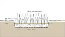 Constructed wetland systems can be surface flow systems with only free-floating macrophytes, floating-leaved macrophytes, or submerged macrophytes; however, typical free water surface systems are usually constructed with emergent macrophytes.[17] Subsurface flow-constructed wetlands with a vertical or a horizontal flow regime are also common and can be integrated into urban areas as they require relatively little space.[4]