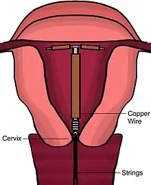 Side effects may be heavy menstrual periods, and/or rarely the device may come out.[3] It is less recommended for people at high risk of sexually transmitted infections as it may increase the risk of pelvic inflammatory disease in the first three weeks after insertion.[6] It is recommended for people who don't tolerate or hardly tolerate hormonal contraceptives. If a woman becomes pregnant with an IUD in place removal is recommended.[6] Very rarely, uterine perforation may occur during insertion if not done properly.[1] The copper IUD is a type of long-acting reversible birth control.[4] It primarily works by killing the sperm.[1]