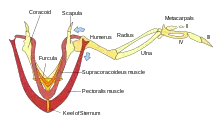 In other tetrapods it joins the scapula to the front end of the sternum and has a notch on the dorsal surface which, along with a similar notch on the ventral surface of the scapula, forms the socket in which the proximal end of the humerus (upper arm bone) is located. The acrocoracoid process is an expansion adjacent to this contact surface, to which the shoulderward end of the biceps brachii muscle attaches in these animals. In birds (and generally theropods and related animals), the entire unit is rigid and called scapulocoracoid. This plays a major role in bird flight. In dinosaurs the main bones of the pectoral girdle were the scapula (shoulder blade) and the coracoid, both of which directly articulated with the clavicle.[3]