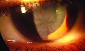 Cornea verticillata, also called vortex keratopathy or whorl keratopathy, is a condition characterised by corneal deposits at the level of the basal epithelium forming a faint golden-brown whorl pattern.[2] It is seen in Fabry disease or in case of prolonged amiodarone intake.[3]