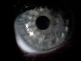 Cornea transplant approximately one week after surgery. Multiple light reflections indicate folds in the cornea, which were later resolved.