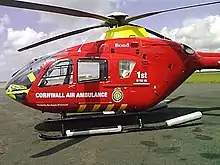 The Cornwall Air Ambulance Trust is a charity that provides a dedicated helicopter emergency medical service (HEMS) for Cornwall and the Isles of Scilly.[2] The service also has two critical care cars that operate when the helicopter is unable to fly.[3] Together they attend about 1,100 incidents per year.[3] As of December 2018, the helicopter service had flown over 28,000 missions since 1987.[4]