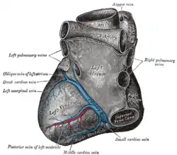 The vessels that remove the deoxygenated blood from the heart muscle are the cardiac veins. These include the great cardiac vein, the middle cardiac vein, the small cardiac vein, the smallest cardiac veins, and the anterior cardiac veins. Cardiac veins carry blood with a poor level of oxygen, from the myocardium to the right atrium. Most of the blood of the coronary veins returns through the coronary sinus. The anatomy of the veins of the heart is very variable, but generally it is formed by the following veins: heart veins that go into the coronary sinus: the great cardiac vein, the middle cardiac vein, the small cardiac vein, the posterior vein of the left ventricle, and the oblique vein of Marshall. Heart veins that go directly to the right atrium: the anterior cardiac veins, the smallest cardiac veins (Thebesian veins).[2]