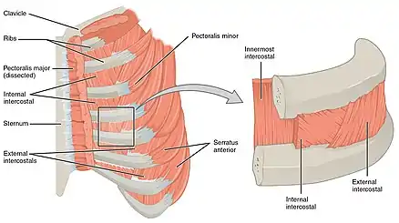 Costochondritis typically presents unilaterally (one side), which is typically the left side.[4] It affects primarily the 2nd to 5th ribs at the sternocostal and costochondral joints.[1] The most commonly reported symptom of costochondritis is chest pain that is often exacerbated by movement and deep breathing. Pain is typically widespread and reproducible with palpation of the anterior (front) chest at the affected joints.[5][6]: 171 Pain from costochondritis can vary between individuals, and is typically described as a sharp, aching, dull, or pressure-like pain.[7] It may also be accompanied by a radiating pain to the shoulder, arm, front neck, or scapula (shoulder blade).[8]: 550