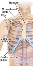 A similar condition known as slipping rib syndrome is also associated with chest pain and inflammation of the costal cartilage.[17] Unlike costochondritis, the pain associated with slipping rib syndrome is often felt in the lower ribs, abdomen, and back, commonly affecting the interchondral junctions of the false 8th to 10th ribs.[18][19] Costochondritis is typically experienced within the sternocostal junctions of the true 2nd to 5th ribs.