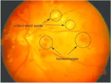 Cotton wool spots are opaque fluffy white patches on the retina of the eye that are considered an abnormal finding during a funduscopic exam (also called an ophthalmoscopic exam).[1] Cotton wool spots are typically a sign of another disease state, most common of which is diabetic retinopathy.[2] The irregularly shaped white patches are a result of ischemia, or reduced blood flow and oxygen, in the retinal nerve fiber layer, which is located in the distribution of the capillaries of the superficial layer of the retina.[2] These areas with reduced blood flow reflect the obstruction of axoplasmic flow due to mechanical or vascular causes and the consequential accumulation as a result of decreased axonal transport.[1][2] This reduced axonal transport can then cause swelling or bulging on the surface layer of the retina, increasing the potential for nerve fiber damage.[2]