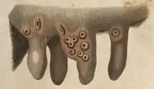 The virus, part of the genus Orthopoxvirus, is closely related to the vaccinia virus. The virus is zoonotic, meaning that it is transferable between species, such as from cat to human. The transferral of the disease was first observed in dairy workers who touched the udders of infected cows and consequently developed the signature pustules on their hands.[5] Cowpox is more commonly found in animals other than bovines, such as rodents. Cowpox is similar to, but much milder than, the highly contagious and often deadly smallpox disease.[5] Its close resemblance to the mild form of smallpox and the observation that dairy farmers[6] were immune to smallpox inspired the modern smallpox vaccine, created and administered by English physician Edward Jenner.[7]