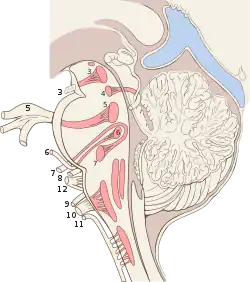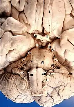 The midbrain of the brainstem has the nuclei of the oculomotor nerve (III) and trochlear nerve (IV); the pons has the nuclei of the trigeminal nerve (V), abducens nerve (VI), facial nerve (VII) and vestibulocochlear nerve (VIII); and the medulla has the nuclei of the glossopharyngeal nerve (IX), vagus nerve (X), accessory nerve (XI) and hypoglossal nerve (XII).[10] The olfactory nerve (I) emerges from the olfactory bulb, and depending slightly on division the optic nerve (II) is considered to emerge from the lateral geniculate nuclei.[10]