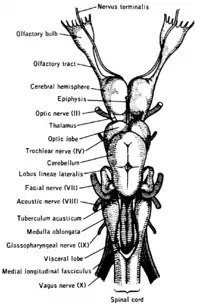The terminal nerves (0), olfactory nerves (I) and optic nerves (II) emerge from the cerebrum, and the remaining ten pairs arise from the brainstem, which is the lower part of the brain.[3]
