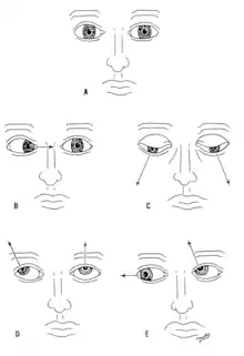 Damage to the oculomotor nerve (III) can cause double vision and inability to coordinate the movements of both eyes (strabismus), also eyelid drooping (ptosis) and pupil dilation (mydriasis).[18] Lesions may also lead to inability to open the eye due to paralysis of the levator palpebrae muscle. Individuals suffering from a lesion to the oculomotor nerve may compensate by tilting their heads to alleviate symptoms due to paralysis of one or more of the eye muscles it controls.[17]