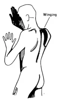 Damage to the accessory nerve (XI) will lead to weakness in the trapezius muscle on the same side as the damage. The trapezius lifts the shoulder when shrugging, so the affected shoulder will not be able to shrug and the shoulder blade (scapula) will protrude into a winged position.[3] Depending on the location of the lesion there may also be weakness present in the sternocleidomastoid muscle, which acts to turn the head so that the face points to the opposite side.[16]