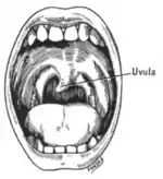 A cranial nerve exam starts with observation of the patient, as some cranial nerve lesions may affect the symmetry of the eyes or face.[16] Vision may be tested by examining the visual fields, or by examining the retina with an ophthalmoscope, using a process known as funduscopy. Visual field testing may be used to pin-point structural lesions in the optic nerve, or further along the visual pathways.[17] Eye movement is tested and abnormalities such as nystagmus are observed for. The sensation of the face is tested, and patients are asked to perform different facial movements, such as puffing out of the cheeks. Hearing is checked by voice and tuning forks. The patient's uvula is examined. After performing a shrug and head turn, the patient's tongue function is assessed by various tongue movements.[16]