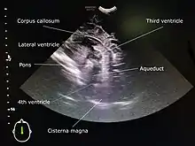 Cranial ultrasound is a technique for scanning the brain using high-frequency sound waves. It is used almost exclusively in babies because their fontanelle (the soft spot on the skull) provides an "acoustic window". A different form of ultrasound-based brain scanning, transcranial Doppler, can be used in any age group. This uses Doppler ultrasound to assess blood flow through the major arteries in the brain, and can scan through bone. It is not usual for this technique to be referred to simply as "cranial ultrasound". Additionally, cranial ultrasound can be used for intra-operative imaging in adults undergoing neurosurgery once the skull has been opened, for example to help identify the margins of a tumour.[1]