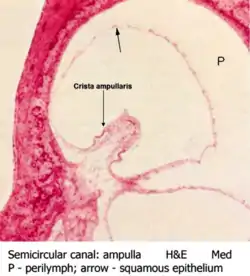 ![]() Semicircular canal: ampulla at medium magnification with a hemotoxylin & eosin stain | |