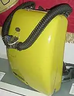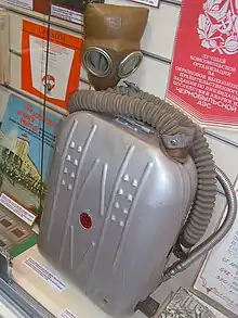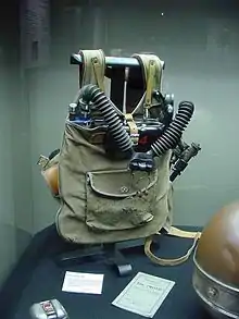 During the Second World War, captured Italian frogmen's rebreathers influenced improved designs for British rebreathers.[39] Many British frogmen's breathing sets used aircrew breathing oxygen cylinders salvaged from shot-down German Luftwaffe aircraft. The earliest of these breathing sets may have been modified Davis Submerged Escape Apparatus; their fullface masks were the type intended for the Siebe Gorman Salvus, but in later operations different designs were used, leading to a fullface mask with one big face window, at first circular or oval and later rectangular (mostly flat, but the sides curved back to allow better vision sideways). Early British frogman's rebreathers had rectangular counterlungs on the chest like Italian frogman's rebreathers, but later designs had a square recess in the top of the counterlung so it could extend further up toward the shoulders. In front they had a rubber collar that was clamped around the absorbent canister.[39] Some British armed forces divers used bulky thick diving suits called Sladen suits; one version of it had a flip-up single faceplate for both eyes to let the user get binoculars to his eyes when on the surface.