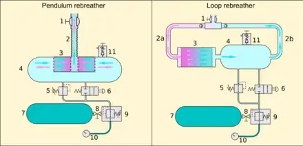 There are two basic arrangements controlling the flow of breathing gas inside the rebreather, known as the pendulum and loop systems.