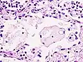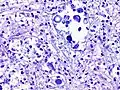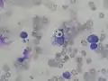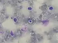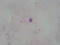 | Micrograph of cryptococcosis showing the characteristically thick capsule of cryptococcus. Field stain. | |