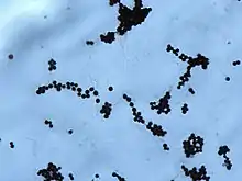 Cryptococcus neoformans typically grows as a yeast (unicellular) and replicates by budding. It makes hyphae during mating, and eventually creates basidiospores at the end of the hyphae before producing spores. Under host-relevant conditions, including low glucose, serum, 5% carbon dioxide, and low iron, among others, the cells produce a characteristic polysaccharide capsule.[6] The recognition of C. neoformans in Gram-stained smears of purulent exudates may be hampered by the presence of the large gelatinous capsule which apparently prevents definitive staining of the yeast-like cells. In such stained preparations, it may appear either as round cells with Gram-positive granular inclusions impressed upon a pale lavender cytoplasmic background or as Gram-negative lipoid bodies.[7] When grown as a yeast, C. neoformans has a prominent capsule composed mostly of polysaccharides. Under the microscope, the India ink stain is used for easy visualization of the capsule in cerebral spinal fluid.[8] The particles of ink pigment do not enter the capsule that surrounds the spherical yeast cell, resulting in a zone of clearance or "halo" around the cells. This allows for quick and easy identification of C. neoformans. Unusual morphological forms are rarely seen.[9] For identification in tissue, mucicarmine stain provides specific staining of polysaccharide cell wall in C. neoformans. Cryptococcal antigen from cerebrospinal fluid is thought to be the best test for diagnosis of cryptococcal meningitis in terms of sensitivity, though it might be unreliable in HIV-positive patients.[10]