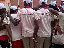 This initial misinformation increased the general distrust in foreigners, and the idea that Ebola was not in Africa before their arrival led to attacks on many health workers, as well as blockages of aid convoys blocked from checking remote areas. A burial team, which was sent in to collect the bodies of suspected Ebola victims from West Point in Liberia, was blocked by several hundred residents chanting: "No Ebola in West Point." Health ministries and workers started an aggressive Ebola information campaign on all media formats to properly inform the residents and allow aid workers safe access to the high risk areas.[7][8] In Guinea, riots broke out after medics disinfected a market in Nzerekore. Locals rumored that the medics were actually spreading the disease. In nearby Womey, 8 people distributing information about Ebola were killed by the villagers.[9]