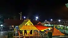 Sabarimala Temple is situated at the place of that name in Pathanamthitta District, Kerala.[69] Women of reproductive age were not permitted to worship there; the ban was said to be out of respect to the celibate nature of the deity to whom it is dedicated, Shasta, an underage teenage male.[70] A Kerala high-court judgement had legalized this interpretation, and forbade women from entering the temple since 1991.[71] In September 2018, a judgement of the Supreme Court of India ruled that all Hindu pilgrims regardless of gender can enter. The Constitution bench of the Supreme Court held that any exception placed on women because of biological differences violates the Constitution – that the ban violates the right to equality under Article 14.[72][73][74][75][76] This verdict led to protests, demonstrations and violence by millions of Ayyappa devotees (both male and female) supported by the Hindu right-wing Bharatiya Janata Party and opposed by the LDF led state government.[77] About ten women attempted to enter Sabarimala, despite threats of physical assault, but failed to reach the sanctum sanctorum.[78][79] Defying such protests, two women activists belonging to the previously barred age group associated with the ruling Communist Party of India (Marxist) finally entered the temple through the rear gate, on the early hours of 2 January 2019, with the help of police and local administration. When this alleged action was brought to the notice of the temple priests and authorities, the temple was closed for ritual purification.[80][81] Controversy regarding the implementation of this verdict continues.
