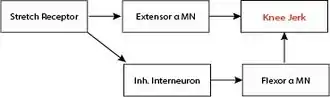 Reflexes can be very simple, as in the monosynaptic reflex, which only contains one synapse, or more complicated, as in the polysynaptic reflex, which involves more than one synapse. The knee jerk reflex is a common example of a monosynaptic reflex when one is looking at the quadriceps motor response of kicking your leg out. It can also be used as an example of a polysynaptic reflex when looking at the involvement of inhibitory interneurons to relax the hamstrings. The complexity of the reflex can be estimated by examining the time delay, or latency, between the electrical stimulation of the sensory neuron and the corresponding motor response, as measured by EMG (electromyography). Most reflexes can be categorized in one of three groups depending on the latency of EMG response. The short-latency reflex (SLR) is the fastest (~40-50 ms) and involves a mono-synaptic pathway. The medium-latency reflex (MLR) utilizes interneurons within the spinal cord and is typically ~80-90 ms. The long-latency reflex (LLR) is ~120-140 ms, suggesting that it is mediated by additional supraspinal input from the brain.[2]