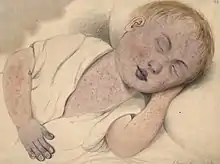 Child with congenital heart disease with central cyanosis that is worsened by measles. Note the bluish-purple discoloration of the fingernails, lips, eyelids, and nose, along with prominent nail clubbing.