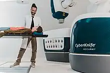 The CyberKnife System is a radiation therapy device manufactured by Accuray Incorporated. The CyberKnife System is the only radiation delivery system in the world that features a linear accelerator (linac) directly mounted on a robot to deliver high-energy x-rays or photons used in radiation therapy and combines real-time artificial intelligence (AI)-driven target tracking and treatment delivery.[1] The platform is designed to deliver precise stereotactic radiosurgery (SRS) and stereotactic body radiation therapy (SBRT) for the treatment of benign tumors, malignant tumors, neurologic disorders and other medical conditions.[2]
