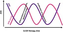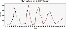 There is a very high risk of life-threatening infections and death at an early age.[13] The quality of life and survival greatly improves with G-CSF treatment, which is practiced since the late 1980s.[21] Unlike severe congenital neutropenia, individuals with cyclic neutropenia have a better response to G-CSF and do not have a risk of developing myelodysplastic syndrome (MDS) and acute myeloid leukemia (AML).[1][3] However, in long-term observation of over 300 patients with CyN, there has been one case of developing chronic myelogenous leukemia (CML) and one of AML,[21][24] indicating it is also a pre-leukemic condition, but the risk is "very low" (1%[18]),[26] and the risk is "correlated with disease severity rather than with occurrence of an ELANE mutation".[10] According to Donadieu et al. (2011), "the cumulative risk of experiencing at least one serious (potentially life-threatening) infection by age 20 years is similar in patients with permanent and cyclic neutropenia, although the former patients tend to have earlier manifestations".[13]
