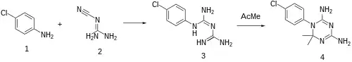 The reaction between 4-chloroaniline [106-47-8] (1) and dicyandiamide (aka 2-cyanoguanidine) [461-58-5 ] (2) gives 4-chlorophenylbiguanide [5304-59-6] (3). The condensation of this immediately with acetone to form the aminal cycloguanil (4).