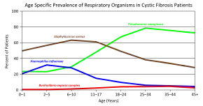 Over time, both the types of bacteria and their individual characteristics change in individuals with CF. In the initial stage, common bacteria such as S. aureus and H. influenzae colonize and infect the lungs.[18] Eventually, Pseudomonas aeruginosa (and sometimes Burkholderia cepacia) dominates. By 18 years of age, 80% of patients with classic CF harbor P. aeruginosa, and 3.5% harbor B. cepacia.[18] Once within the lungs, these bacteria adapt to the environment and develop resistance to commonly used antibiotics. Pseudomonas can develop special characteristics that allow the formation of large colonies, known as "mucoid" Pseudomonas, which are rarely seen in people who do not have CF.[55] Scientific evidence suggests the interleukin 17 pathway plays a key role in resistance and modulation of the inflammatory response during P. aeruginosa infection in CF.[57] In particular, interleukin 17-mediated immunity plays a double-edged activity during chronic airways infection; on one side, it contributes to the control of P. aeruginosa burden, while on the other, it propagates exacerbated pulmonary neutrophilia and tissue remodeling.[57]