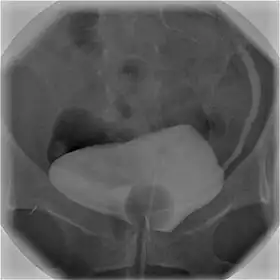![]() Cystography image showing contrast in the urinary bladder and left ureter (right side of image). | |