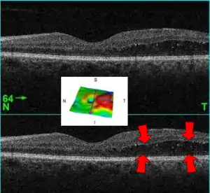 | A 61-year-old man with medical history of type 2 diabetes that presents a macular edema, evidenced by an OCT (the edema marked with arrows). The central image is a 3D reconstruction of the retinal thickness (the edema is coloured in red). | |