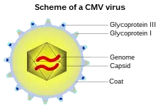 Cytomegalovirus (CMV) (from cyto- 'cell' via Greek κύτος kútos- 'container' + μέγας mégas 'big, megalo-' + -virus via Latin vīrus 'poison') is a genus of viruses in the order Herpesvirales, in the family Herpesviridae,[3] in the subfamily Betaherpesvirinae. Humans and other primates serve as natural hosts. The 11 species in this genus include human betaherpesvirus 5 (HCMV, human cytomegalovirus, HHV-5), which is the species that infects humans. Diseases associated with HHV-5 include mononucleosis and pneumonia,[4][5] and congenital CMV in infants can lead to deafness and ambulatory problems. [6]