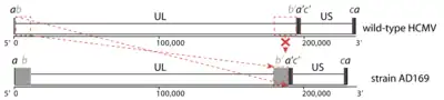 Class E genome of HCMV. The unique long and unique short regions are indicated as UL and US. Repeat regions are indicated as a, b and c sequences, where primes designate inverted orientations. Sequences ab and b′a′ correspond to the terminal/internal repeat long (TRL/IRL); sequences a′c′ and ca correspond to the internal/terminal repeat short (IRS/TRS). Top: typical genome arrangement of wild-type strains; bottom: genome arrangement of strain AD169, a laboratory-adapted strain. Genome rearrangements that have occurred during extensive passaging are indicated in red between the wild-type and laboratory-adapted configurations.[14]