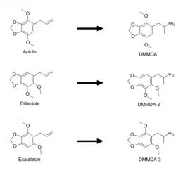 Shulgin's synthesis of DMMDA is reasonably unsafe, since it involves the use of tetranitromethane, which is toxic, carcinogenic and prone to detonating.[12] DMMDA can be made from apiole via other safer methods. Among other methods, DMMDA can be synthesize from apiole via the intermediate chemical 2,5-dimethoxy-3,4-methylenedioxyphenylpropan-2-one or DMMDP2P in the same manner as MDA is made from safrole. DMMDP2P can be made from apiole via a Wacker oxidation with benzoquinone. DMMDP2P can be alternatively made by subjecting apiole to an isomerisation reaction to yield isoapiole followed by a Peracid oxidation and finally a hydrolytic dehydration.[13] Then the DMMDP2P can then be subjected to a reductive amination with a source of nitrogen, such as ammonium chloride, and a reducing agent, such as sodium cyanoborohydride or an amalgam of mercury and aluminium, to yield freebase DMMDA.[14]