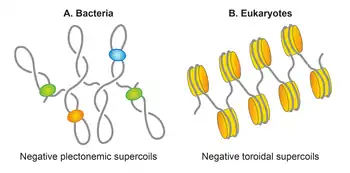 Bacterial DNA is packed with the help of polyamines and proteins called nucleoid-associated proteins. Protein-associated DNA occupies about 1/4 of the intracellular volume forming a concentrated viscous phase with liquid crystalline properties, called the nucleoid. Other research also indicated that the genome of bacteria occupies approximately 10-15% of the bacteria's volume.[5] Similar DNA packaging exists also in chloroplasts and mitochondria. Bacterial DNA is sometimes referred to as the bacterial chromosome. Bacterial nucleoid evolutionary represents an intermediate engineering solution between the protein-free DNA packing in viruses and protein-determined packing in eukaryotes.[1]