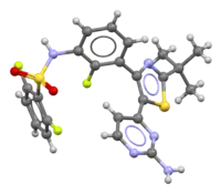 Dabrafenib, sold under the brand name Tafinlar among others, is an anti-cancer medication used for the treatment of cancers associated with a mutated version of the gene BRAF.[1] Dabrafenib acts as an inhibitor of the associated enzyme B-Raf, which plays a role in the regulation of cell growth.