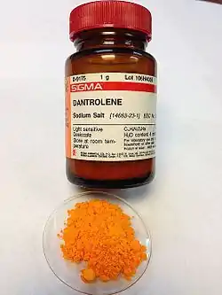 Dantrolene sodium, sold under the brand name Dantrium among others, is a postsynaptic muscle relaxant that lessens excitation-contraction coupling in muscle cells.[3][4][5] It achieves this by inhibiting Ca2+ ions release from sarcoplasmic reticulum stores by antagonizing ryanodine receptors.[6] It is the primary drug used for the treatment and prevention of malignant hyperthermia, a rare, life-threatening disorder triggered by general anesthesia or drugs. It is also used in the management of neuroleptic malignant syndrome, muscle spasticity (e.g. after strokes, in paraplegia, cerebral palsy, or patients with multiple sclerosis), and poisoning by 2,4-dinitrophenol[7][8] or by the related compounds dinoseb and dinoterb.[9]