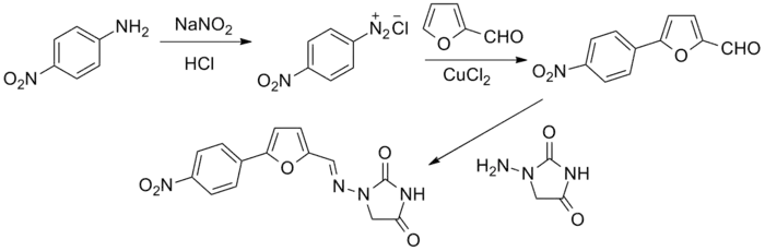 The original patent synthesis started with para-nitroaniline which undergoes diazotization followed by a copper(II) chloride catalyzed arylation with furfural (essentially a modified Meerwein arylation). This then reacts with 1-aminohydantoin to form the final product.