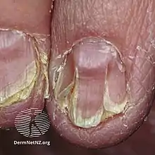 - Nail disease leading to V-shaped nicks at the edge of the nail.