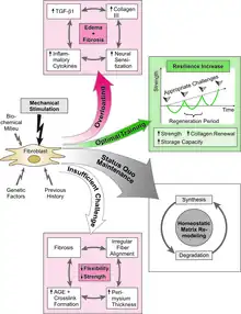 It is also an application of the Mechanostat model of Harold Frost which was originally developed to describe the adaptational response of bones; however – as outlined by Harold Frost himself – it also applies to fibrous collagenous connective tissues, such as ligaments, tendons and fascia.[2][3] The "stretch-hypertrophy rule" of that model states: "Intermittent stretch causes collagenous tissues to hypertrophy until the resulting increase in strength reduces elongation in tension to some minimum level".[4] Similar to the behavior of bony tissues this adaptational response occurs only if the mechanical strain exceeds a certain threshold value. Harold Frost proposed that for dense collagenous connective tissues the related threshold values are around 23 Newton/mm2 or 4% strain elongation.[5]