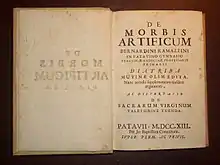 The De Morbis Artificum Diatriba (Dissertation on Workers' Diseases) is the first book written specifically about occupational diseases and work-related risk prevention.[1] It was written in Latin by Bernardino Ramazzini and published in Modena in 1700. In 1713 the second edition was printed in Padua. Since a long time, Ramazzini is the acknowledged father of occupational medicine (Pagel JL. Über Bernardino Ramazzini und seine Bedeutung in der Geschichte der Gewerbehygiene. Dtsch Med Wschr 1891;17:224-6; Garrison FH. Founder and father of industrial medicine. Bull NY Acad Med 1934;12:679-94). The Diatriba has been cited by Adam Smith, Karl Marx, and Cotton Mather, and is considered a seminal work in the field of occupational medicine and occupational health.[2] It describes between 53 and 69 different professions, and includes analytical and methodological approaches to diagnose and prevent diseases associated with them.[1][3] It was the first book to consider substance exposure as a cause of headaches.[4]