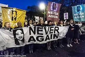 On 14 November 2012, more than 2,000 people gathered in her memory and to protest against Ireland's abortion laws outside the Dáil in Dublin.[21] In addition, candle-light vigils were held in Cork[22] and in Belfast the following day.[23] The government's expert committee in abortion, to address the A, B and C v Ireland judgement, handed in its report to the Department of Health the evening before the news story broke.[24]