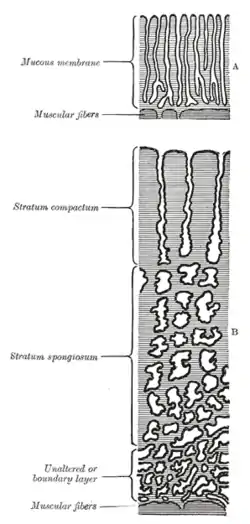 Diagrammatic sections of the uterine mucous membrane: A. The non-pregnant uterus. B. Decidua parietalis; the mucous membrane in the pregnant uterus and not beneath the placenta.
