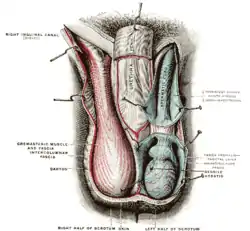The scrotum. On the left side the cavity of the tunica vaginalis has been opened; on the right side only the layers superficial to the cremaster have been removed. (Right inguinal canal visible at upper left.)