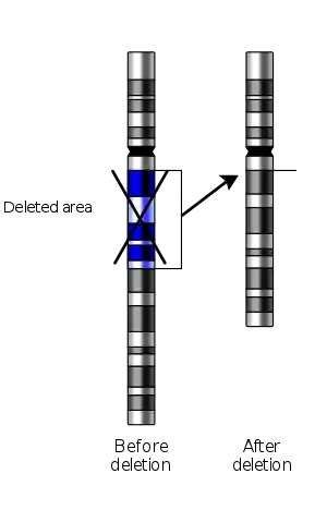 In genetics, a deletion (also called gene deletion, deficiency, or deletion mutation) (sign: Δ) is a mutation (a genetic aberration) in which a part of a chromosome or a sequence of DNA is left out during DNA replication. Any number of nucleotides can be deleted, from a single base to an entire piece of chromosome.[1] Some chromosomes have fragile spots where breaks occur, which result in the deletion of a part of the chromosome. The breaks can be induced by heat, viruses, radiation, or chemical reactions. When a chromosome breaks, if a part of it is deleted or lost, the missing piece of chromosome is referred to as a deletion or a deficiency.[2]