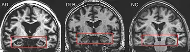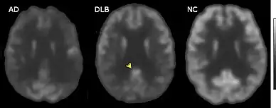 Direct laboratory-measurable biomarkers for DLB diagnosis are not known, but several indirect methods can lend further evidence for diagnosis.[25] The indicative diagnostic biomarkers are: reduced dopamine transporter uptake in the basal ganglia shown on PET or SPECT imaging; low uptake of 123iodine-metaiodobenzylguanidine (123I-MIBG) shown on myocardial scintigraphy; and loss of atonia during REM sleep evidenced on polysomnography. Supportive diagnostic biomarkers (from PET, SPECT, CT, or MRI brain imaging studies or EEG monitoring[124]) are: lack of damage to medial temporal lobe (damage is more likely in AD[116]); reduced occipital activity; and prominent slow-wave activity on EEG.[25]